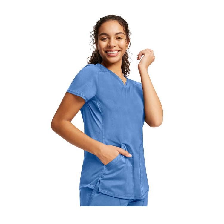 Add a sporty touch to your medical wardrobe with this V-neck top featuring two patch pockets and instrument loops.