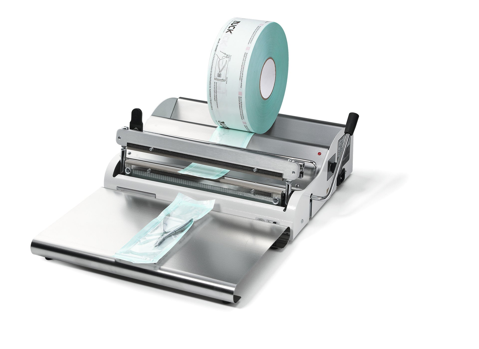 Dispositif d'étanchéité d'impulsion pour emballage de produits stériles avec signal acoustique de temps de soudage et témoin lumineux combiné. Répond aux exigences de la norme DIN 58953-7. Convient à tous les emballages de stérilisation standard avec et sans soufflet.